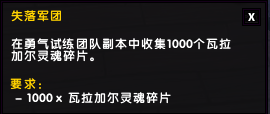 之前的测试也已经知道获取方式就是击败奥丁之后领取任务!失落军团(在勇气试炼团队副本中收集1000个瓦拉加尔灵魂碎片。)
