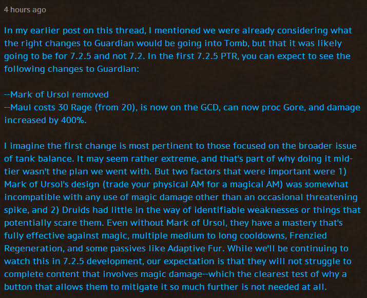 第一个改动和最近关乎坦克平衡的议题最为相关。它看起来非常极端,因此我们没有立刻做出改动,而是推后到下一个副本。关于这个有两点很重要的是 1) 这个技能的设计预期(通过牺牲物理减伤来得到法术减伤)并不符合所有非爆发性法术伤害的情形 2) 现在太缺乏能对熊坦产生威胁的场合。即使没有乌索尔印记,熊还有对法术完全生效的精通,各种中~长CD的减伤,狂暴恢复和毛皮适应等机制。我们会继续在开发7.2.5的过程中观察熊坦,我们的预期是熊并不因此在有法术伤害的场合失去竞争力——而这正证实了这个“按一下就能获得的大额法术减伤”其实并不必要。