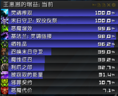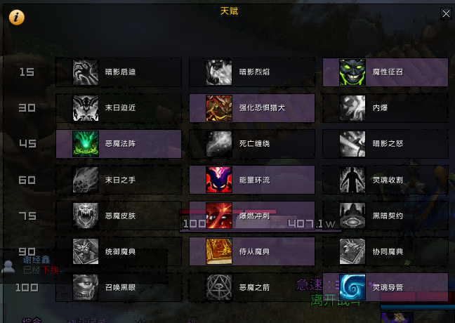 本人大多时候使用的是这样一套天赋,其中第一层暗影启迪在如今大量使用恶魔增效的手法下,在实战中收益尚可,但是我比较偏爱魔性征兆,这一层看个人喜好调整。第二层是看boss战情况调整的,你想尽快的打末日降临就选择末日迫近。第四层在实战中,单体战时能量环流稍优于末日之手,假如你不适应手动上末日,可以选择末日之手,但是在有ADD的战斗中,ADD可以跳出末日的情况下,选择末日之手。