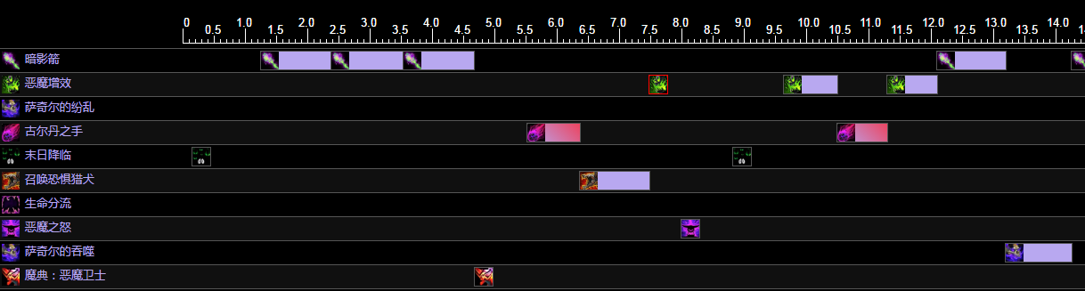 本人除非打不到boss例如古尔丹毁灭者风暴,占星师背身躲吞噬世界之力,才会连续使用恶魔增效,其他情况都是使用暗影箭攒片循环。关于场上存在3波小鬼和2个鬼骑狗时是暗影箭还是增效,我都试过,无法评价优劣,个人认为还是使用暗影箭。