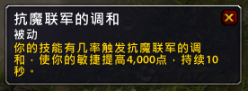 在PvP环境下,抗魔联军的调和特效为获得2000点力量,智力,敏捷或全能属性,每一级巅峰增加150点属性(从200点下调)。