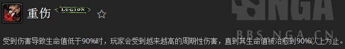 重伤:受到伤害导致生命值低于90%时,玩家会受到越来越高的周期性伤害,直到其生命值被治愈到90%以上为止。