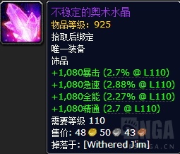 吉姆掉落不稳定的奥术水晶,不稳定的奥术水晶也可以暴击到925装等。很多人期待的饰品,所以千万别错过喔!在阿苏纳守望者飞行点下方的洞穴可以找到他。