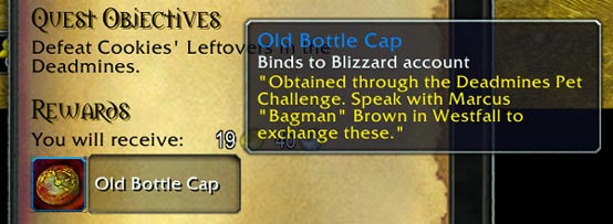 这个“老瓶盖”是战网绑定物品,最大堆叠数量为50,千万不要看它名字不顺眼,就看扁了它,要想获得三只新宠物,全靠“老瓶盖”。