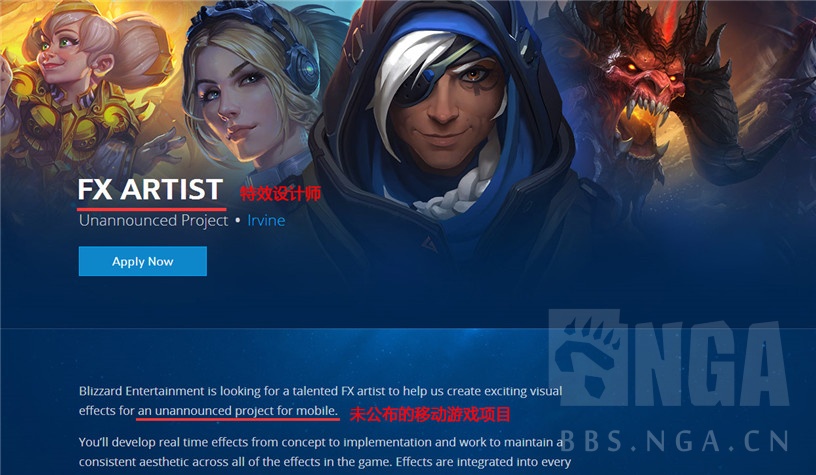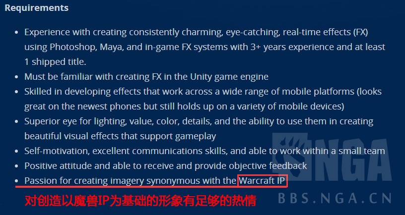 暴雪这次是为一个未公布的移动游戏项目招聘特效设计师。其职位要求中提到“对创造以魔兽IP为基础的特效形象有足够的热情”,也就是说,这个手游和魔兽有莫大的关联,至少和炉石一样,拥有大量的魔兽元素。或许,去年10月内部转岗的魔兽总监Tom Chilton就是在领导这款与魔兽有关的移动游戏的开发团队。