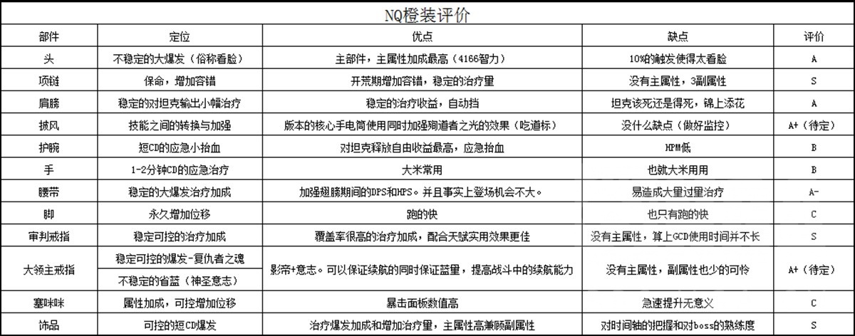 你的任务就是基于Tank,围绕Tank来进行,所以你的前提就不说了。加上这个副本对T是真的不算很友好,所以安心照顾好你的小乖乖是你的当务之急,因为他们或许真的不容易(那个wst,没问题吧?)。根据我之前提及到的,这个版本boss大多数是没有太强掉血节奏而是技能大掉血的,所以记得开好自己的神器和翅膀,不要吝啬,因为平稳期实在会相当平稳,而且也就只有在那种时候,开上技能打打地鼠才可以辛苦进前二了(史诗难度下20人想想都美滋滋),当然我坚信在人数减少的情况下的史诗难度下,NQ的数据当然会好看很多。(开荒期治疗再弱只要能过,同等水平也差不到哪儿去的,为了数据和装逼,冲吧~ 以上言论出自哪本名著忘记了)