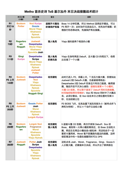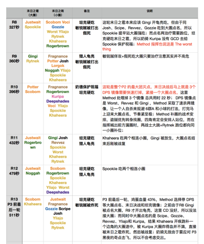 那么,在认真观看Method公会FD视频,以及主力成员战士 Fragnance、术士 Deepshades 和坦克 Sco 的 POV 视频后,我统计了一份表格,详细说明 Method 对于'末日决战'的应对策略: