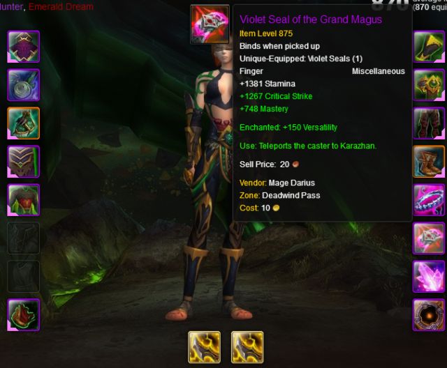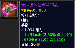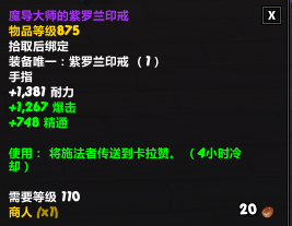 升级后是魔导大师的紫罗兰印戒875等级,1267暴击/748精通的戒指,特效是传送到卡拉赞(当年的第一把橙杖效果?)