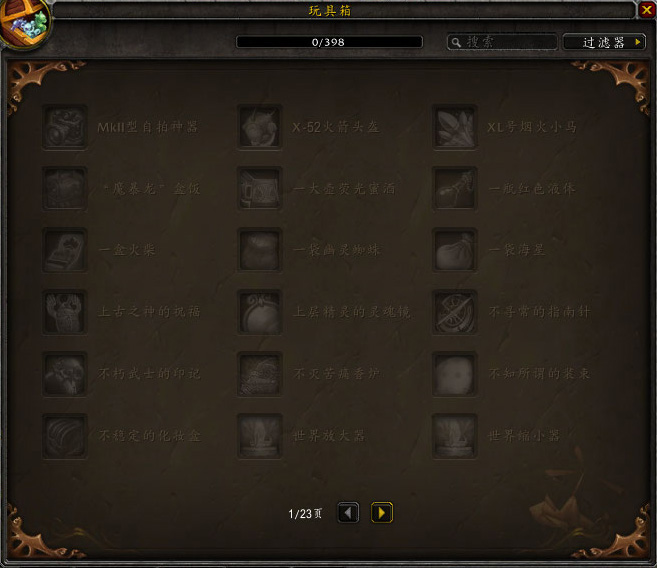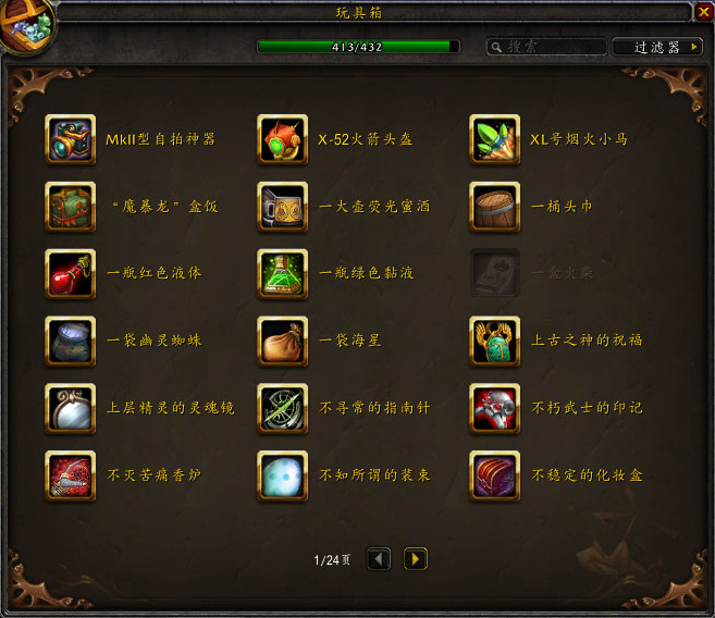 1.一桶头巾(潜行者职业玩具,在德拉诺搜索偷窃人型生物,可获得各类道具,可兑换为肮脏铸币,玩具通过1000肮脏铸币交换。)