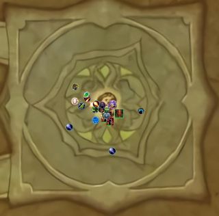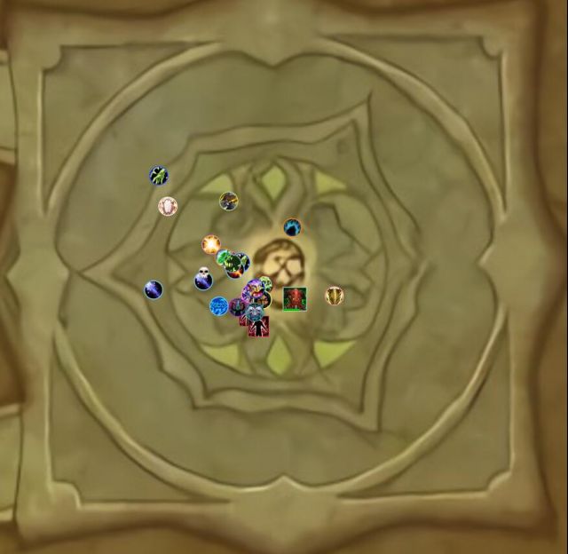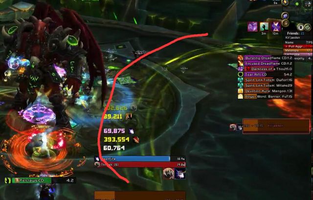 2、boss会点名一个人,这个人需要跑远把距离拉开,让所有人分摊。如图所示,此时邪dk中了点名,所有人帮着分摊。(注意人和人之间有点距离,这个伤害是回响机制。很有可能直接把自己炸死)。