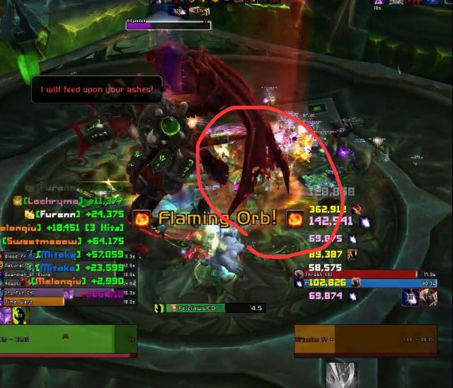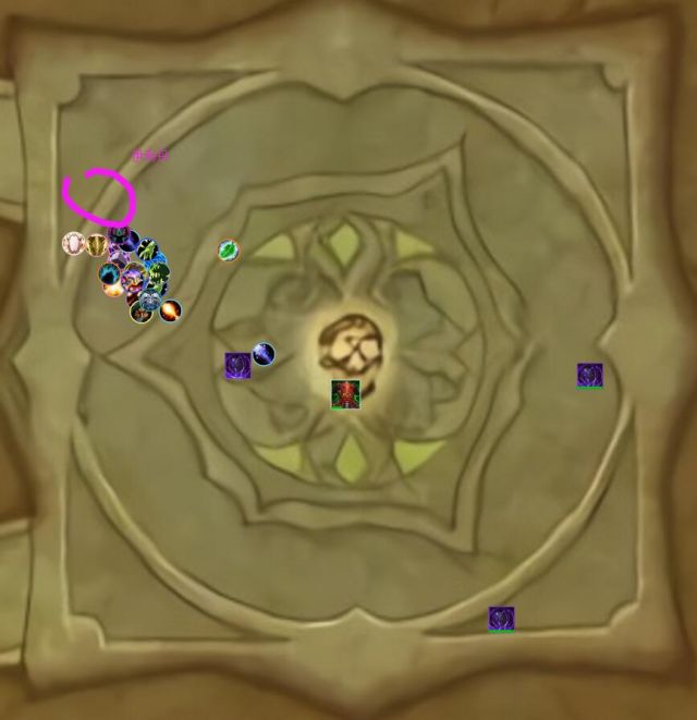 3、回来以后马上会有第一次暗影映像点名。被点名体积会变超级大。请去RL指定位置集合(我们是boss右脚),然后开A(毁灭闪电卡cd)。