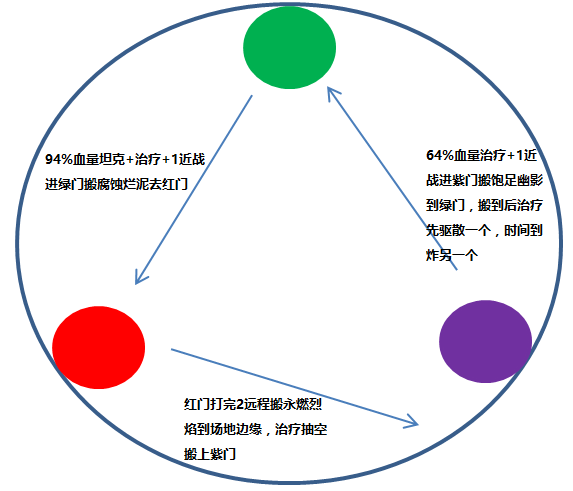 红门里的大怪身上有3层减伤BUFF,需要三个人从绿门里搬绿水炸盾