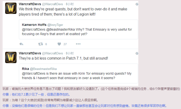 11.11号光棍节蓝推中,暴雪曾回复玩家说肯瑞托世界任务变少了,结果收到大量玩家的回复,很多玩家表示很喜欢肯瑞托的任务,很有趣也与其他世界任务很不一样!