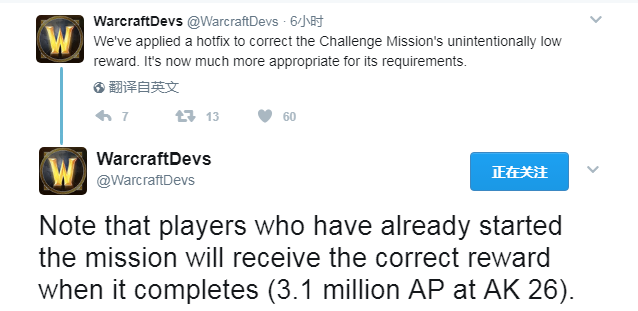 我们已经部署了一个在线修正,以修正无意中造成的挑战任务(译者注:职业大厅随从任务,指挥中心建好之后刷新,需要3个900装等的随从,耗时2天,原先只奖励一个绿色的几十万神器能量物品)奖励过低的问题。现在它的奖励会更匹配于任务要求。